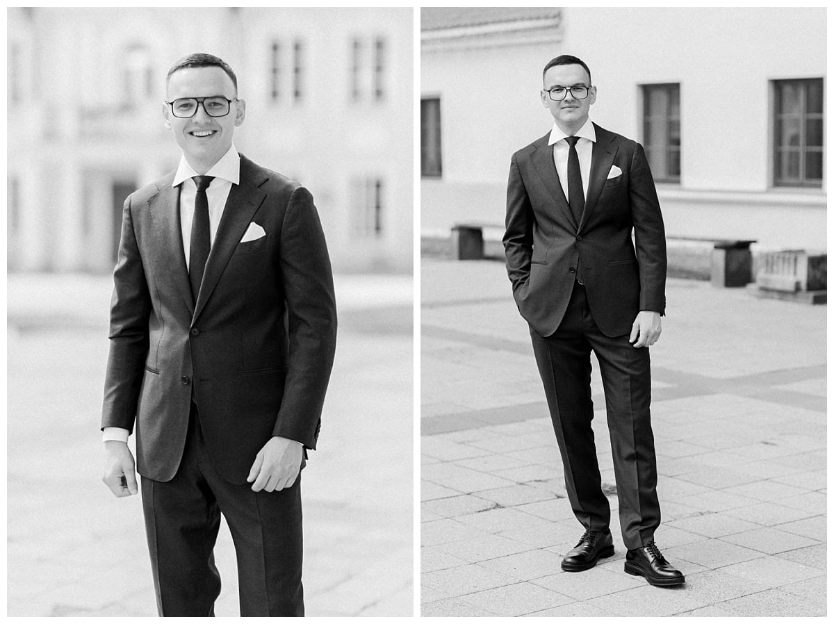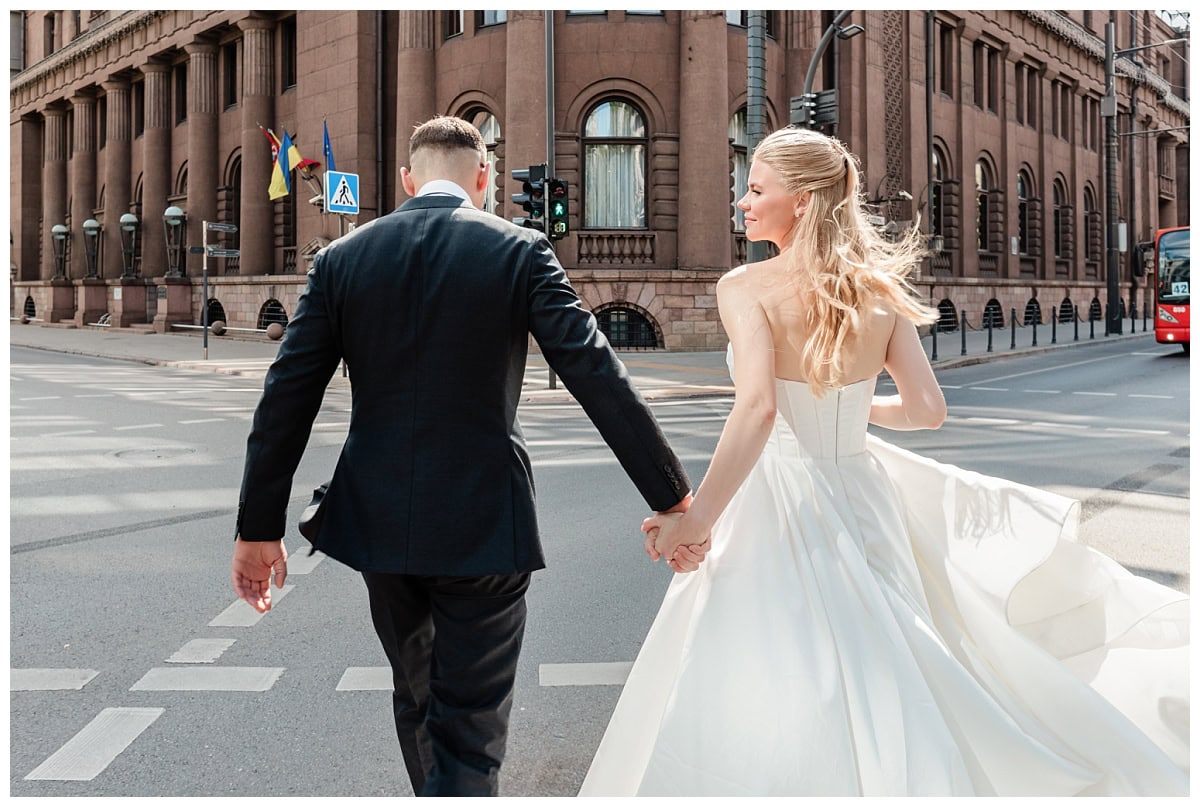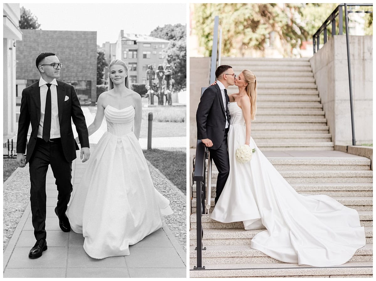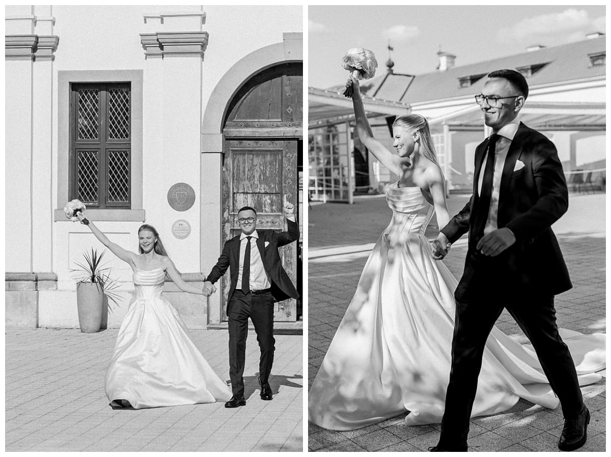 A wedding at the Cathedral in Kaunas is always a breathtaking affair. The magnificence of the Basilica provided a stunning backdrop for their heartfelt ceremony. Following the ceremony, we wandered through the charming streets of Kaunas Old Town, capturing the city’s unique character as a backdrop for their portraits.  We continued the photoshoot in the surroundings of Unity Square. We stopped at Donelaičio restaurant for a refreshing aperol spritz, where I discovered a touching connection to the couple’s history. It was in this very spot that Vytenis had proposed to Gabrielė, and, as they shared, it was also where his father had proposed to his mother. This unexpected revelation added a layer of sentimental significance to the day, making their proposal spot even more meaningful.