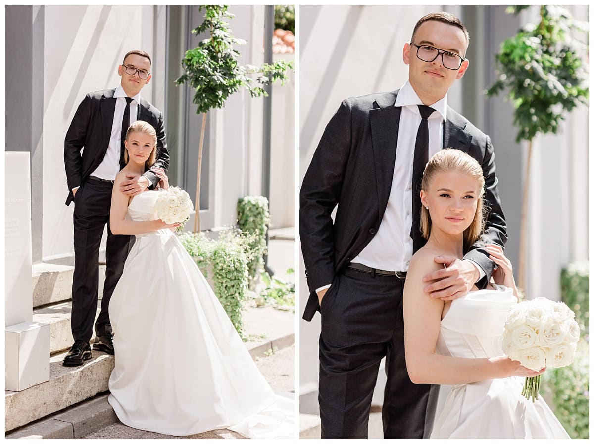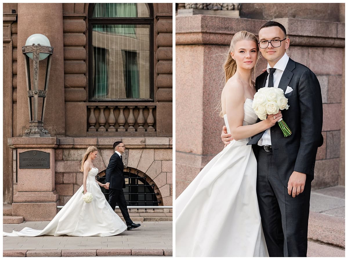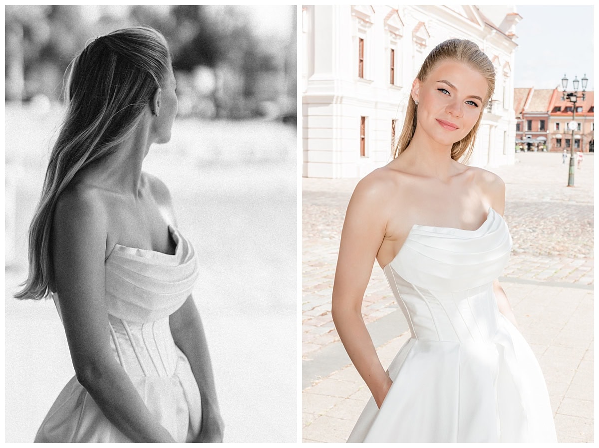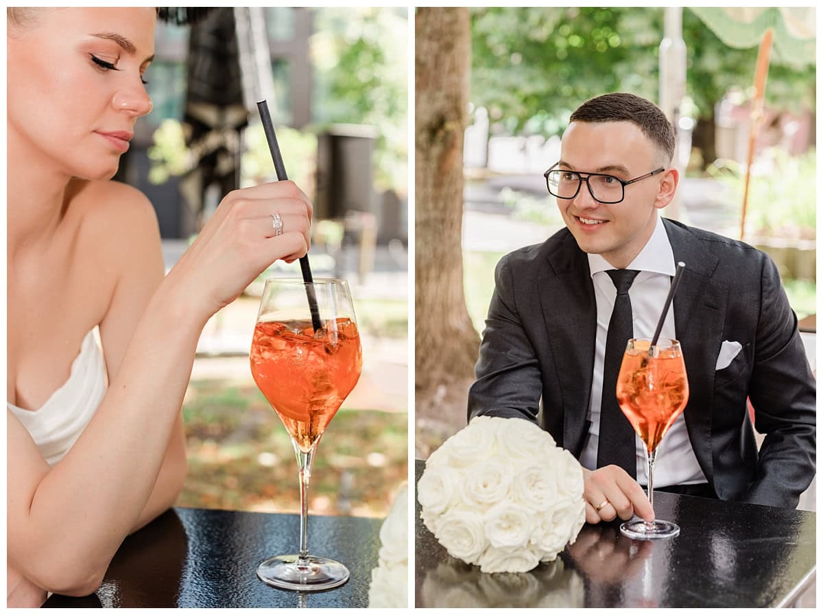 A wedding at the Cathedral in Kaunas is always a breathtaking affair. The magnificence of the Basilica provided a stunning backdrop for their heartfelt ceremony. Following the ceremony, we wandered through the charming streets of Kaunas Old Town, capturing the city’s unique character as a backdrop for their portraits.  We continued the photoshoot in the surroundings of Unity Square. We stopped at Donelaičio restaurant for a refreshing aperol spritz, where I discovered a touching connection to the couple’s history. It was in this very spot that Vytenis had proposed to Gabrielė, and, as they shared, it was also where his father had proposed to his mother. This unexpected revelation added a layer of sentimental significance to the day, making their proposal spot even more meaningful.