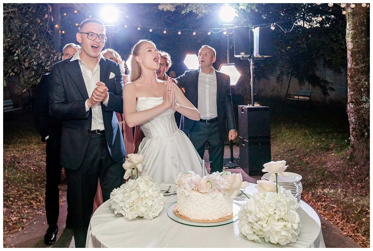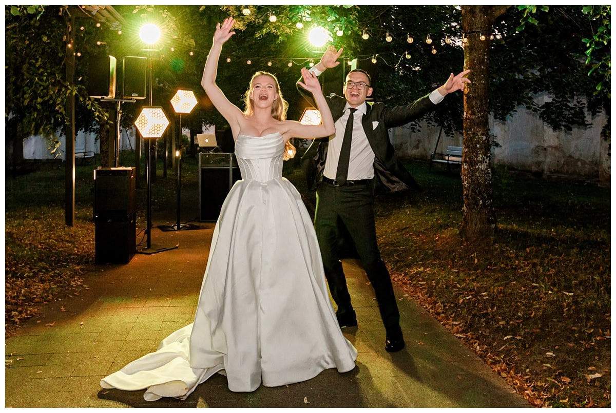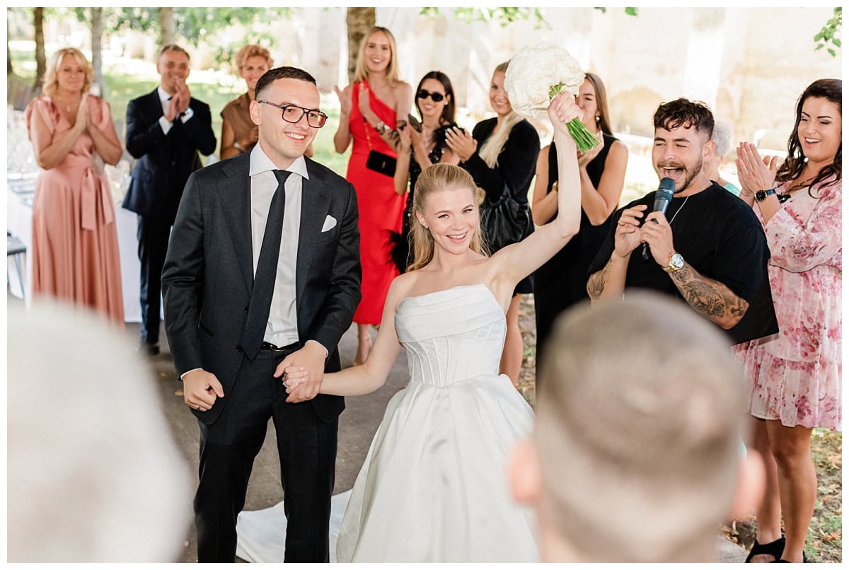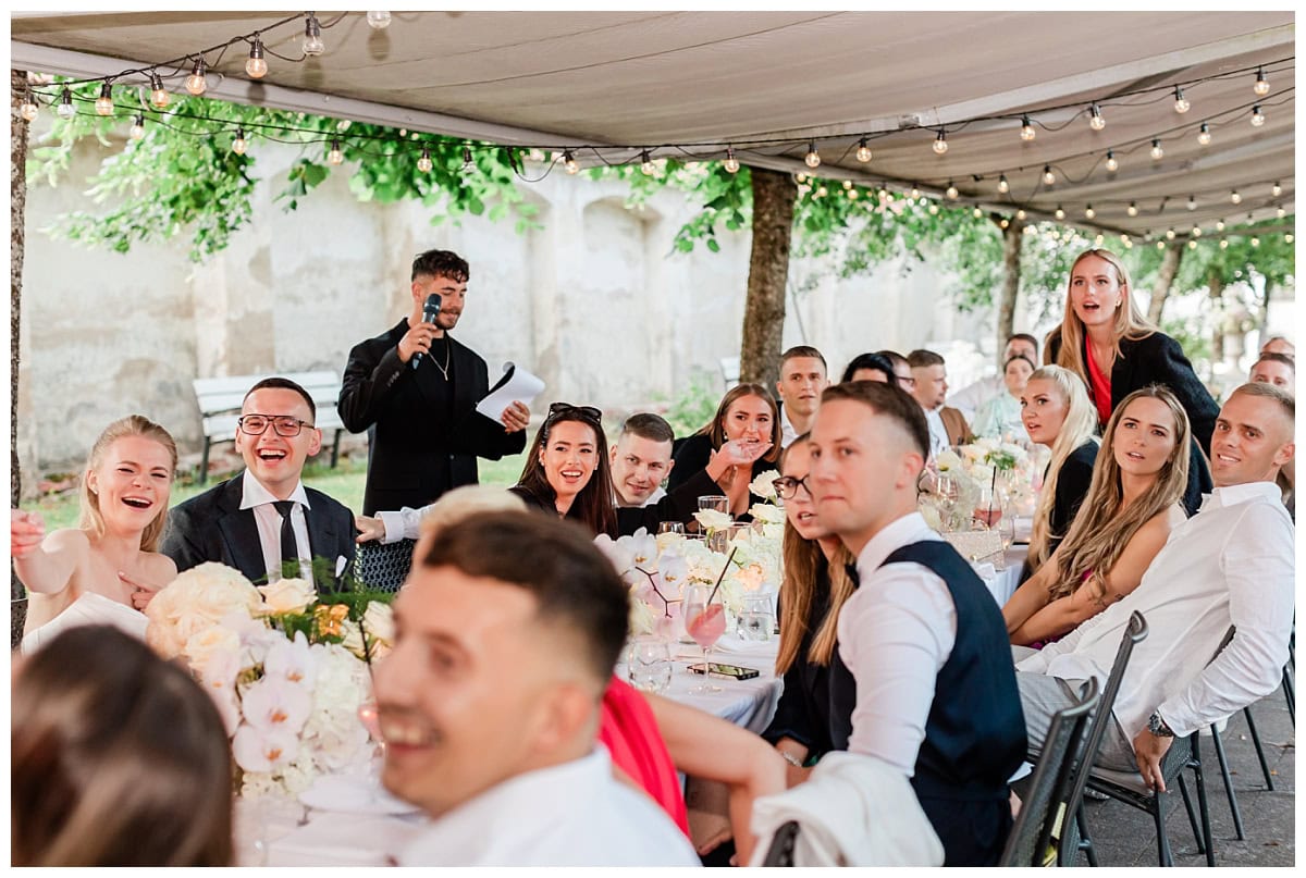 Back at Monte Pacis, the reception unfolded with warmth and laughter. Friends and family gathered to celebrate, enjoying a delicious meal, delightful drinks, and the entertainment of Ernestas from Tūzai. The wedding decor, expertly designed by Erika, perfectly complemented the elegant ambiance.