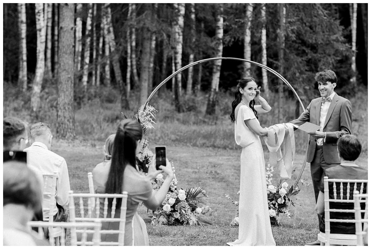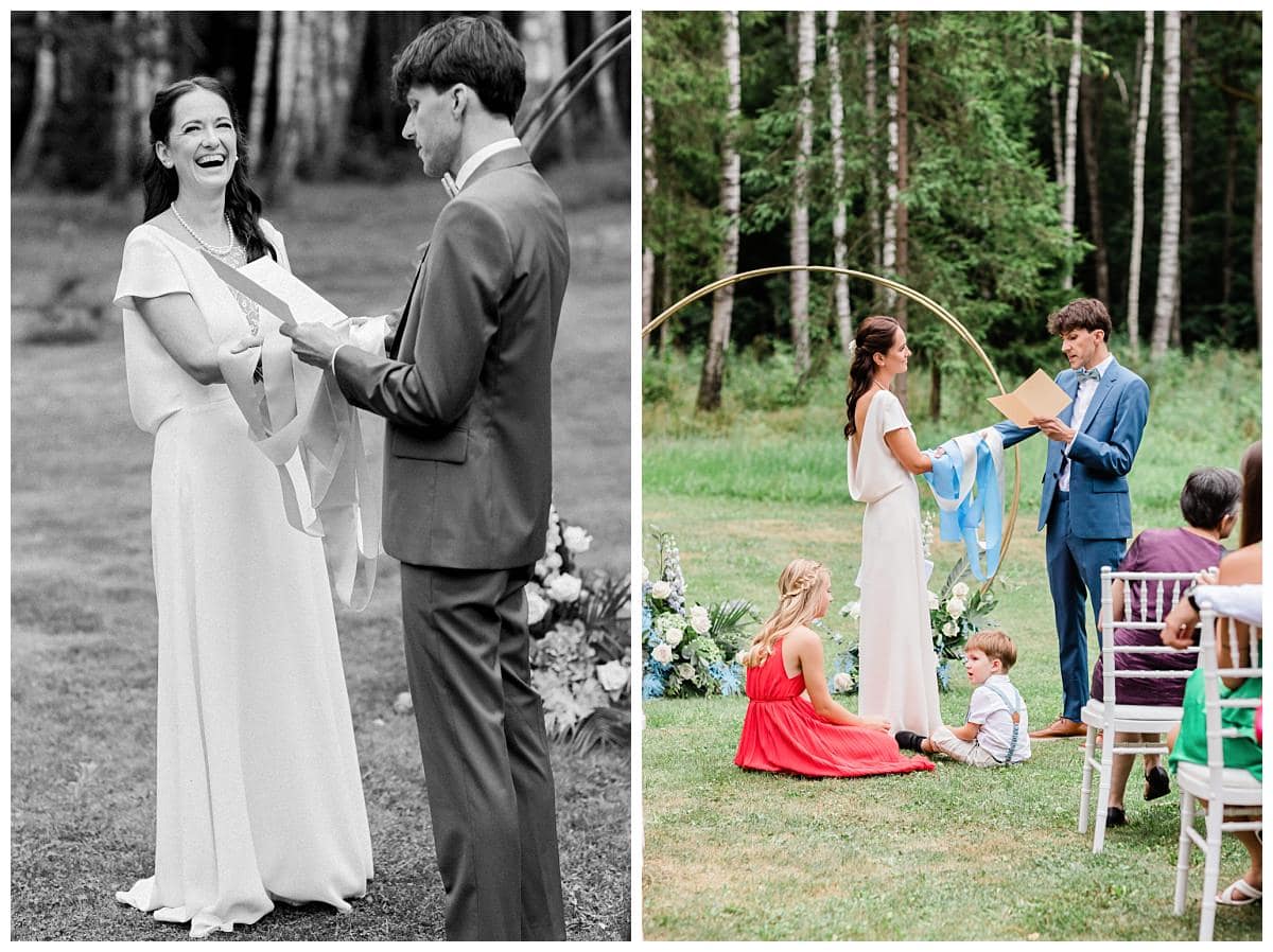 After the civil marriage, a humanist ceremony conducted by Lukas from “Taip kitaip” took place immediately. The newlyweds had chosen a ceremony with ribbons, and the vows took the form of a dialogue in Lithuanian and French. It was a very emotional and sensitive ceremony.