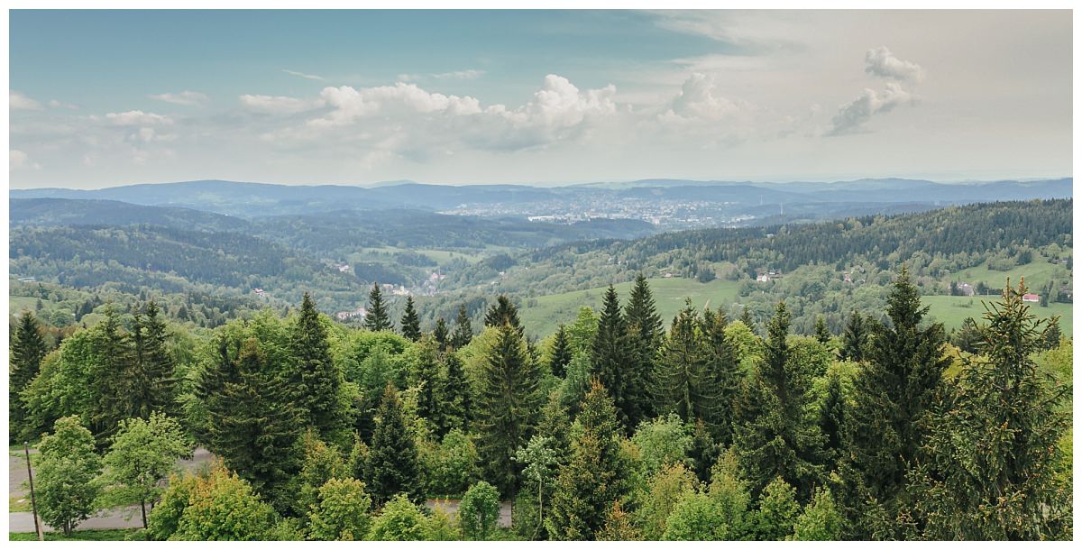 View from Královka tower. A famous stone view tower was built in 1907 on a partly wooded hill. In 1936 a mountain chalet was erected by its side. From the top is a beautiful view of the Jizera mountains, Ještěd hill, and the Lusatian and Giant mountains.
