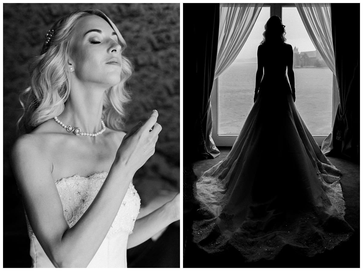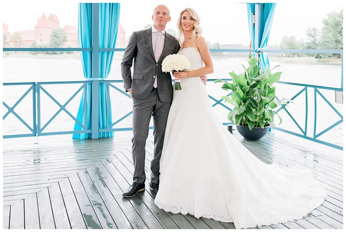 Aš fotografuoti pradėjau jau po pietų. Kaip gerai, kai jaunieji pasirenka kuo vėlesnį ceremonijos laiką. Taip jiems nereikia anksti keltis. Jau vykdama į Trakus, pastebėjau, besiartinančius debesis. Nuotaka nuo pat ryto tikrino lis ar nelis. Prognozės žadėjo nesmarkų lietų, bet oi kaip jos klydo. Besiruošdama jaunoji, pro langą stebėjo, kaip visa komanda, greitai, ceremonijos vietą iš terasos ant vandens perkelia į Boną salę. Nors ceremonmeisterei kelią užtvėrė nuvirtę medžiai, santuoka įvyko. Po jos, buvo suplanuota jaunųjų fotosesija Užutrakio dvare, bet jau supratot, kad ji neįvyko. Aprimus lietui, nusprendžiau fotografuoti terasoje ant vandens, tai buvo vienintelė didesnė erdvė, po stogu.